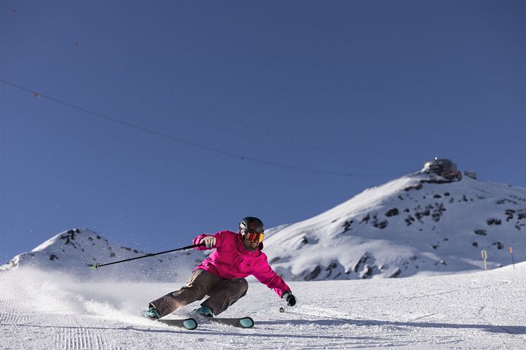 Skifahrer im Engetal mit dem Schilthorn - Piz Gloria im Hintergrund