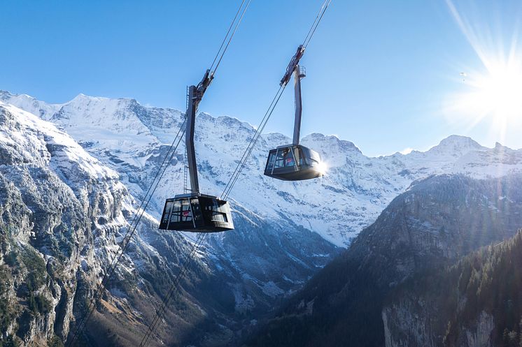 Die zwei Kabinen der steilsten Seilbahn der Welt kreuzen sich zwischen Stechelberg und Mürren.