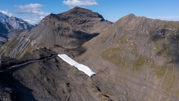 Ein früher Wintersaisonstart soll auch dieses Jahr ermöglicht werden – Snowfaming sei Dank! Bereits im Juni wurden unterhalb der Station Birg rund 95`000 Kubikmeter Schnee in zwei Sommer-Schneedepots versorgt. Dabei wurde der Schnee auf zwei unterschiedlich grossen Flächen mit Pistenfahrzeugen zusammengestossen und in Trapezform je rund sechs bis zehn Meter hoch aufgeschüttet. Die zwei Depots à 53`000, respektive 42`000 Kubikmeter wurden im Engetal eingerichtet. In mühevoller Handarbeit wurden die Oberseiten anschliessend mit Perimeter-Dämmplatten aus Hartschaum abgedeckt, mit Schaumstoff-Matten überdeckt und diese mit einem Nahtabdeckband fixiert. Zum Schluss wurden die gesamten Depots mit weissen Gletschervliesbahnen überdeckt und die Vliesenden zur besseren Fixierung seitlich im Boden eingegraben.